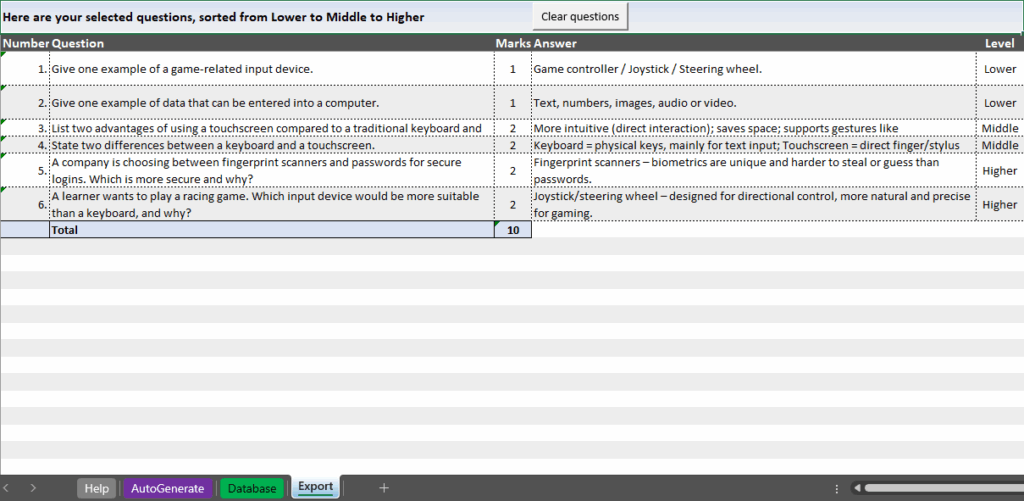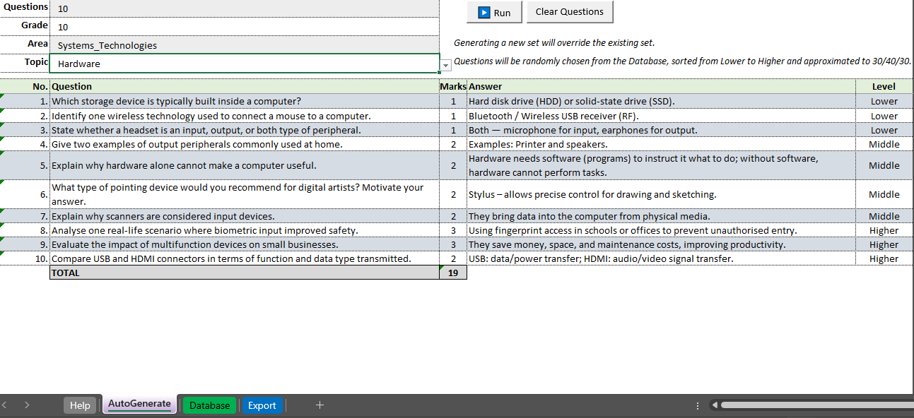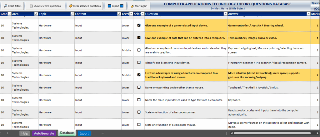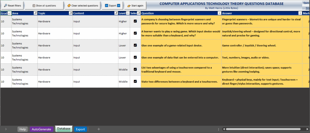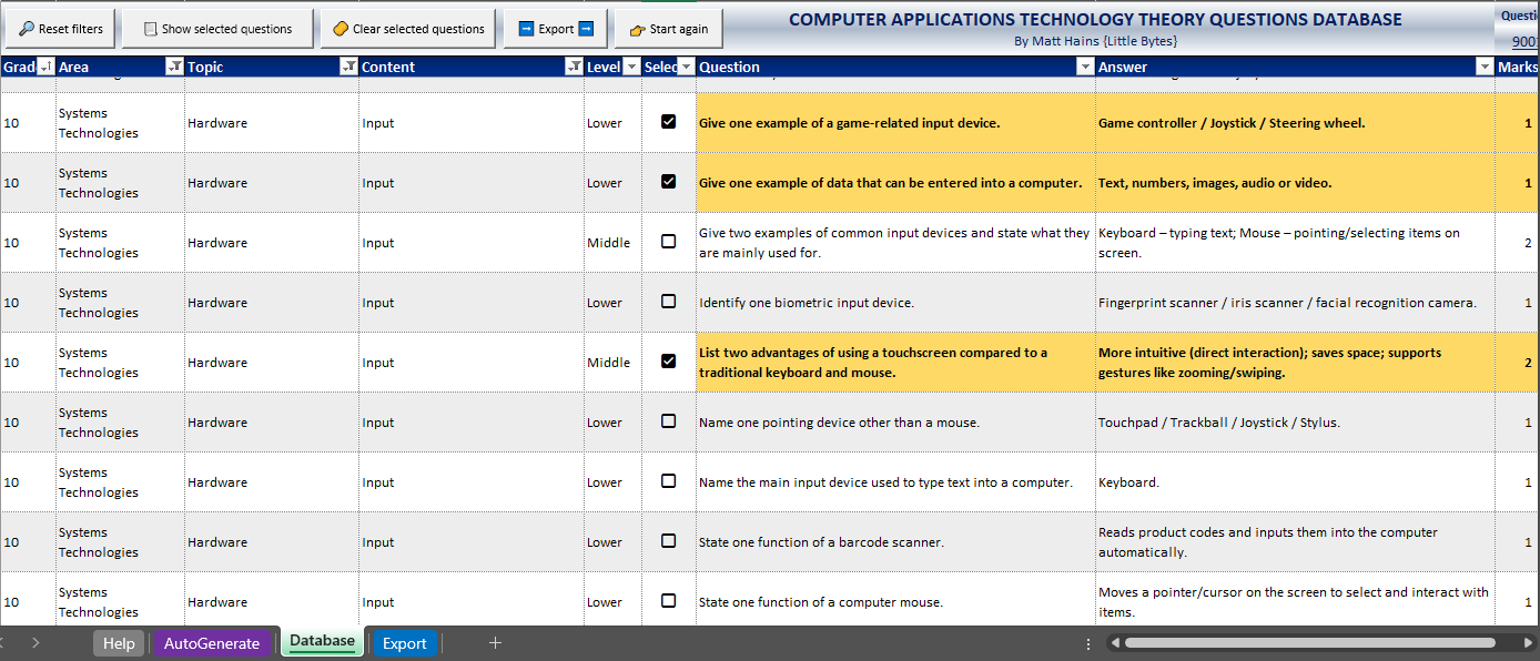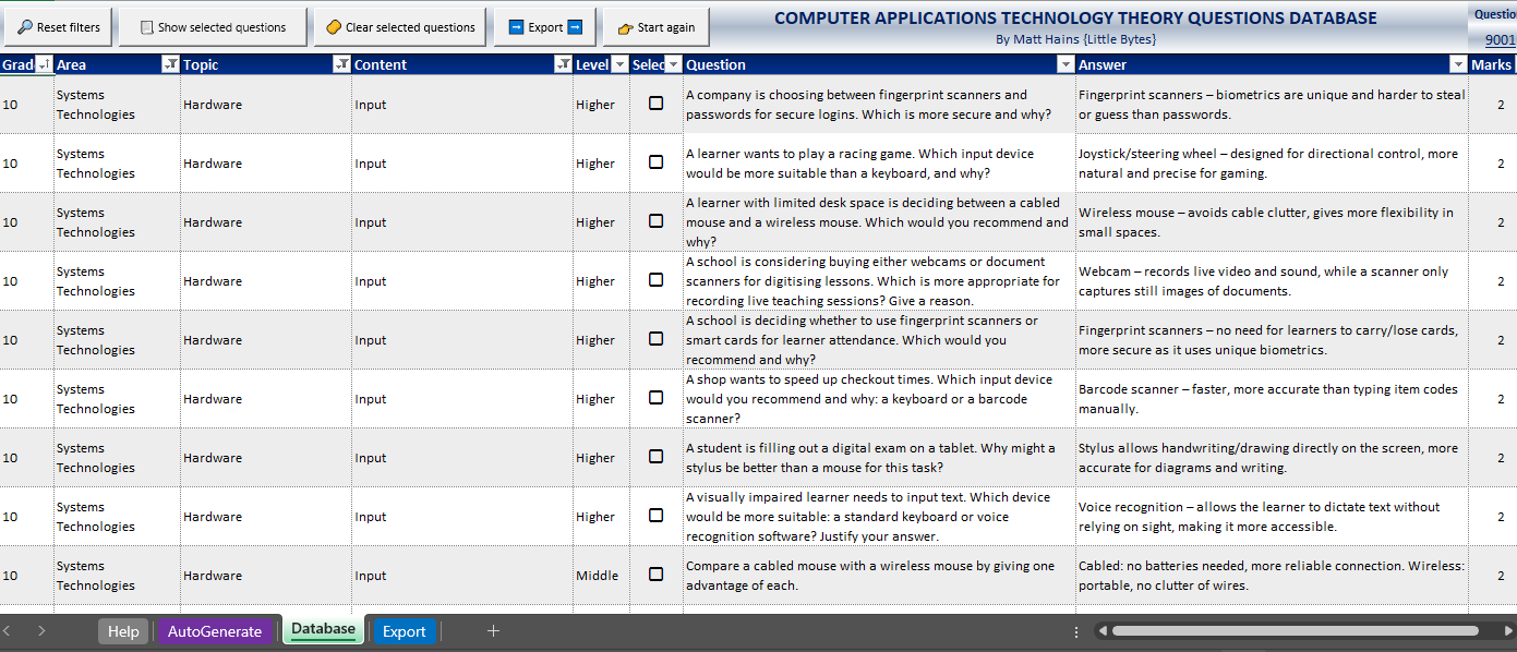 I have created a database of over 9000 CAT Theory questions based on every single area and topic from the CAPS curriculum for teachers to be able to put together scaffolded sets of questions (adjusted to 30% LOT, 40% MOT and 30% HOT) as quickly as possible for assessments and exams. However, what makes this database special is the fact that it is super easy to filter, sort and select questions you want and then have them automatically put into a worksheet you can print or copy and paste from.